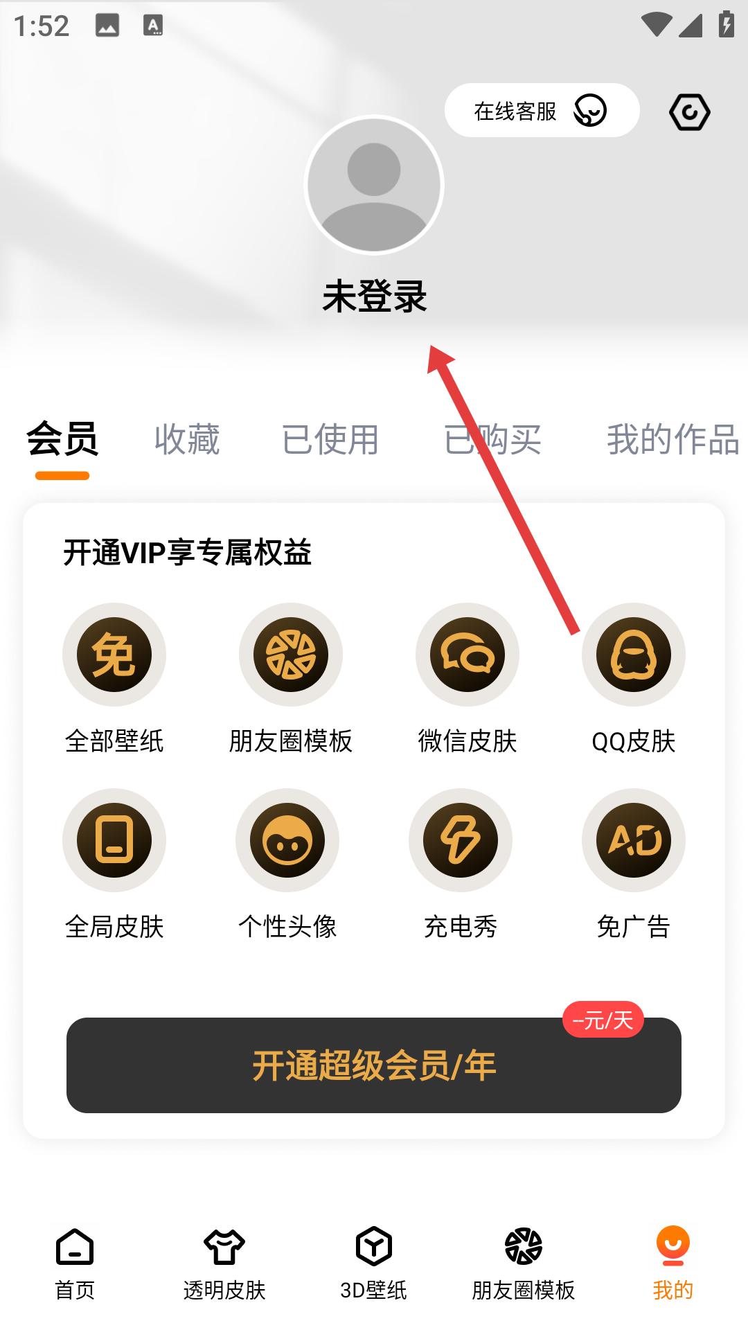 3、從同意協議,到個人中心,點登錄,管理收藏作品,查看已購壁紙,開通會員,解鎖更多權益。