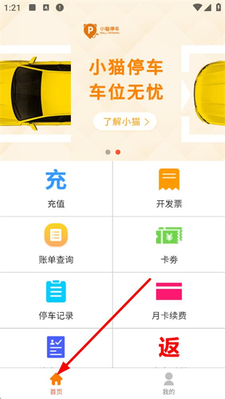 1、首頁可使用充值、開發票、賬單查詢、卡券、停車記錄、月卡續費等功能,還能了解小貓停車的相關介紹,滿足停車服務的各類需求。