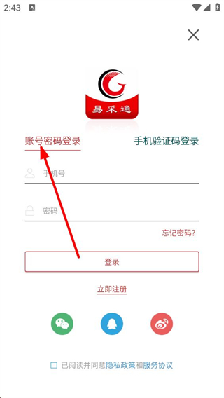 3、登錄界面可選擇賬號密碼登錄或手機驗證碼登錄,也能通過微信QQ等第三方渠道登錄,勾選協議后即可完成登錄操作。