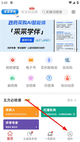 1、進入應用首頁可使用視頻課堂電子書等功能,通過底部導航欄點擊我的,進入個人中心界面,準備進行賬號相關操作。