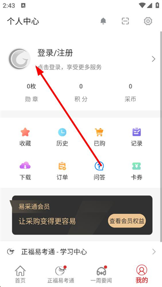2、個人中心可看到登錄、注冊入口,以及收藏歷史等功能選項,點擊登錄、注冊可進入賬號登錄界面,開啟賬號綁定流程。