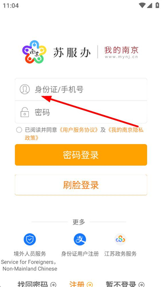 1、登錄界面,輸入手機號和密碼,勾選同意用戶服務協議及隱私政策,可選擇密碼登錄或刷臉登錄,還有境外人員服務、身份證用戶注冊等入口,完成賬號登錄。