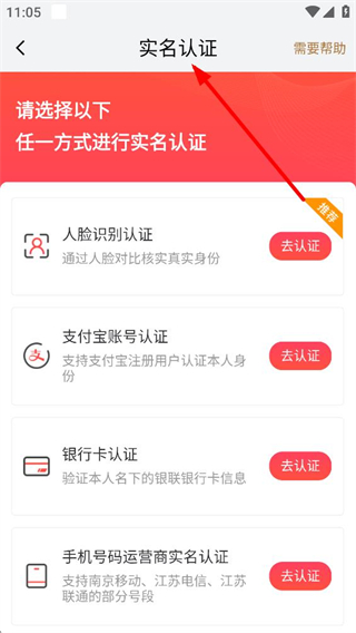 4、實名認證可選擇人臉識別認證、支付寶賬號認證、銀行卡認證、手機號碼運營商實名認證中的任一方式,點擊去認證即可進行身份核實。