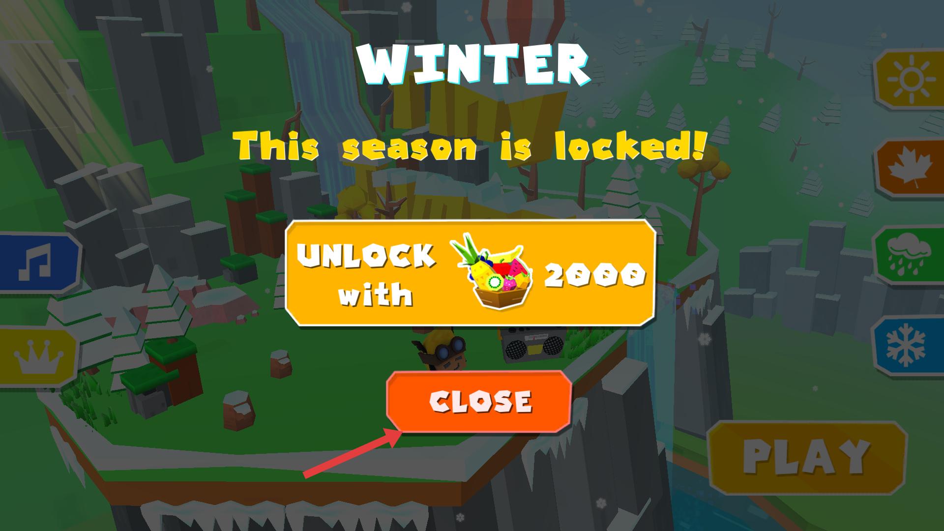 2、若遇到季節鎖定提示,比如冬季場景鎖定,可點擊CLOSE關閉提示,繼續在可玩場景中游玩。