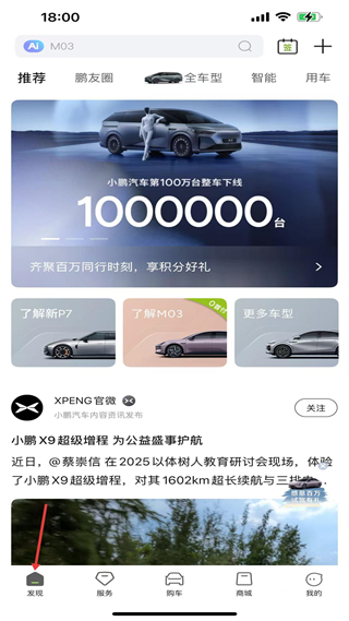 1、發現頁面展示品牌資訊與車型入口,呈現官微內容,是小鵬汽車品牌信息與車型的綜合展示窗口。