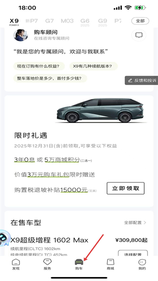 3、購車頁面配備在線購車顧問,展示車型限時禮遇,呈現在售車型信息與配置選擇入口,助力用戶推進購車決策。