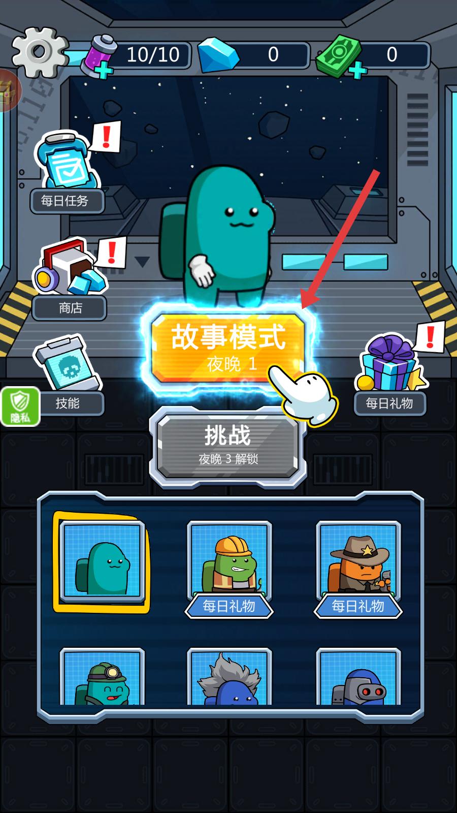 1、進入主界面,看到有故事模式夜晚1的選項,點擊該選項,進入關卡選擇界面,準備挑選具體關卡開啟后續流程。