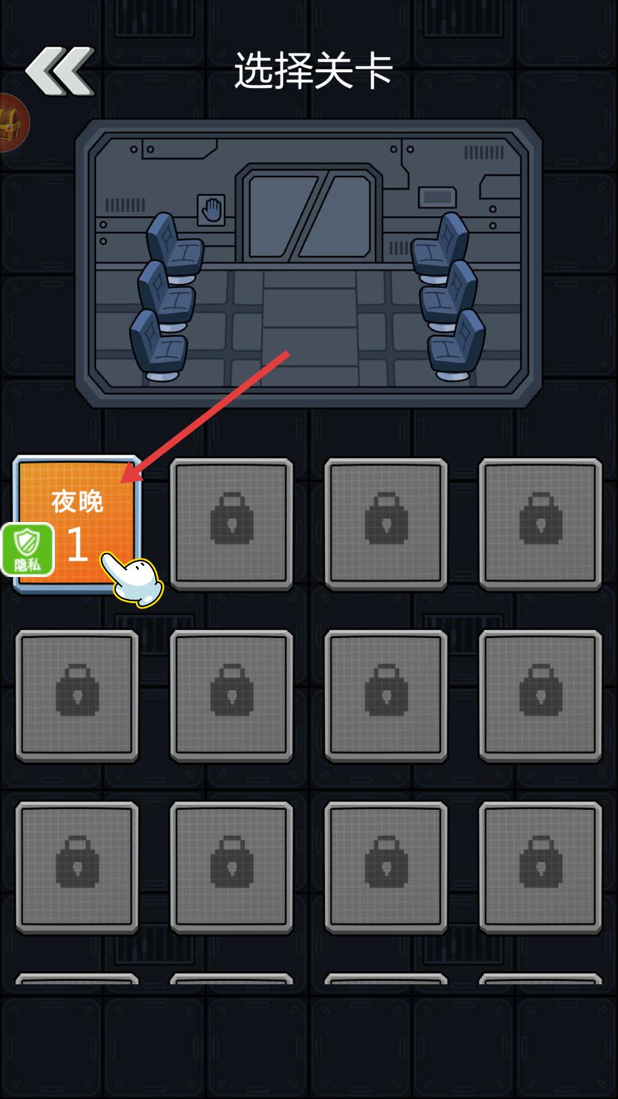 2、在關卡選擇界面,有多個關卡,其中夜晚1關卡是可選擇狀態,點擊夜晚1關卡,進入該關卡的游戲場景。