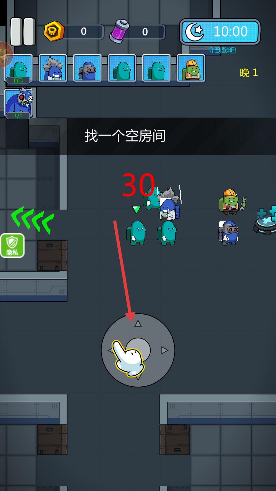 3、進入夜晚1關卡的游戲場景后,看到界面有操作按鈕,根據提示,點擊下方的操作按鈕,操控角色行動,按照找一個空房間的目標推進游戲。