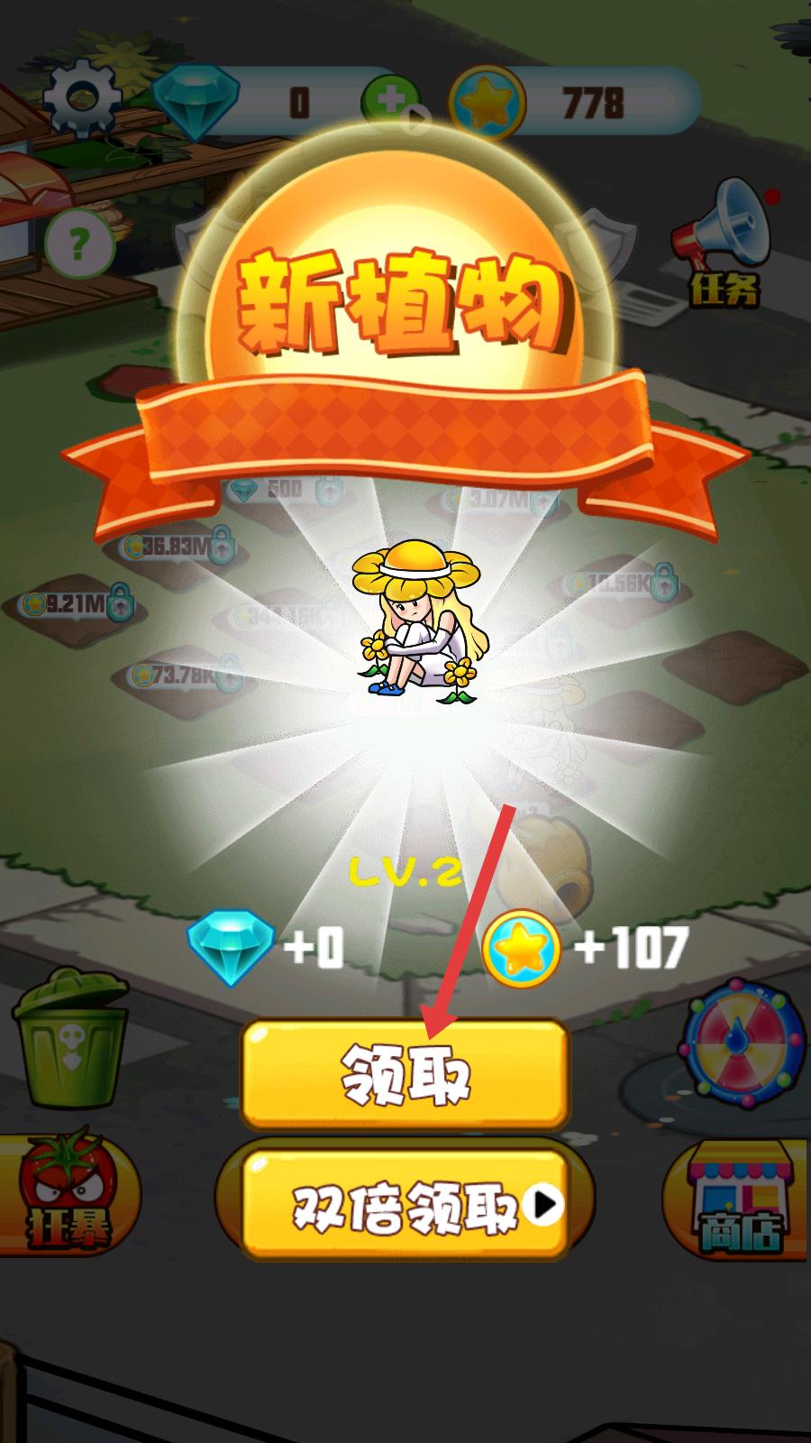 3、完成植物相關操作后,界面彈出新植物提示框,顯示可領取新植物及對應的獎勵,點擊領取按鈕,獲取新植物和獎勵,繼續游戲。