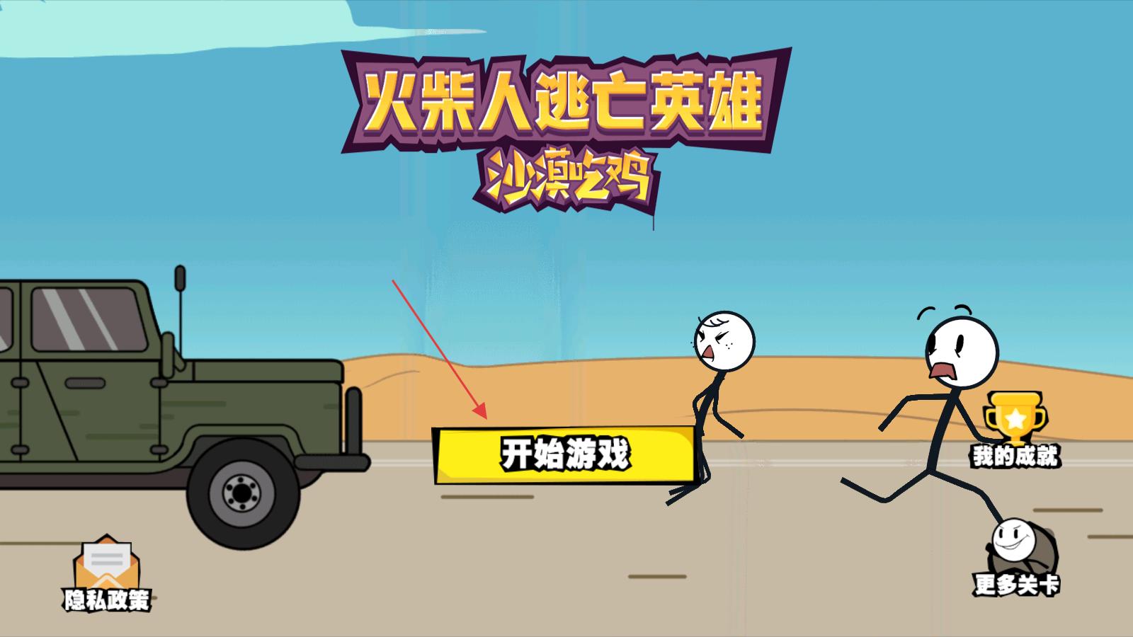 1、進入佳作首界面,找到中間顯眼的開始游戲按鈕,點擊它就能開啟火柴人在沙漠的吃雞冒險,準備應對后續挑戰。
