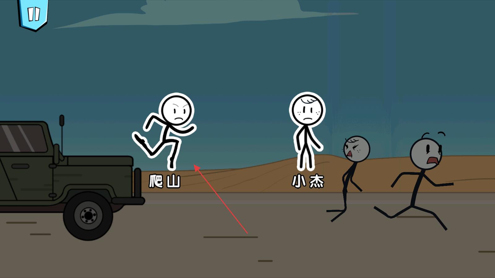 2、加載后出現沙漠場景,看到幾個火柴人角色,其中標有爬山的火柴人是可操作對象,點擊該角色開始移動。