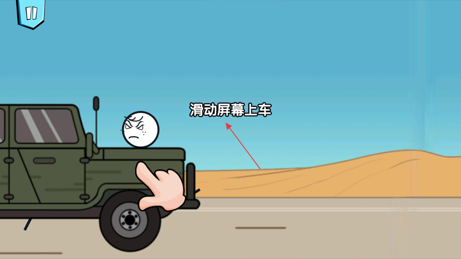 3、接著觸發上車環節,按照提示滑動屏幕,讓火柴人爬上綠色車輛,借助車輛在沙漠場景推進,繼續逃亡吃雞進程。