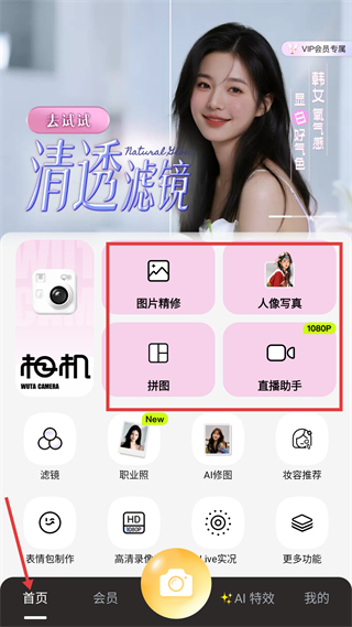 2、進入首頁,可使用圖片精修人像寫真等功能,還有濾鏡AI修圖等工具,部分功能為VIP會員專屬。