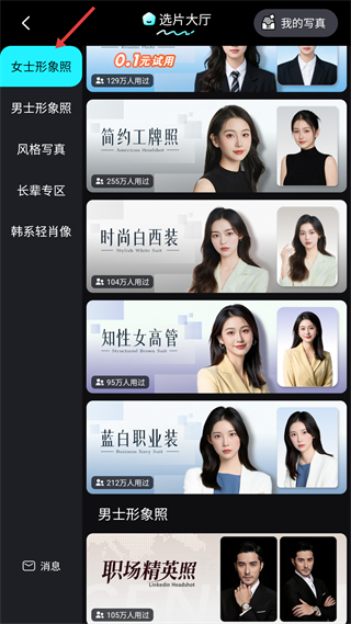 3、進入選片大廳,可查看女士男士形象照等分類模板,了解模板使用人數,選擇適配的形象照風格。