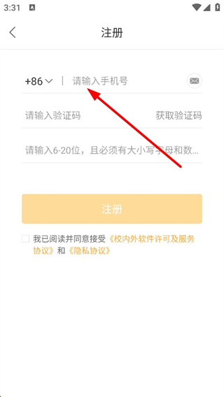 2、進入注冊頁面先輸入手機號,獲取并填寫驗證碼,設置符合要求的密碼,勾選相關協議后點擊注冊,即可完成賬號的創建流程。