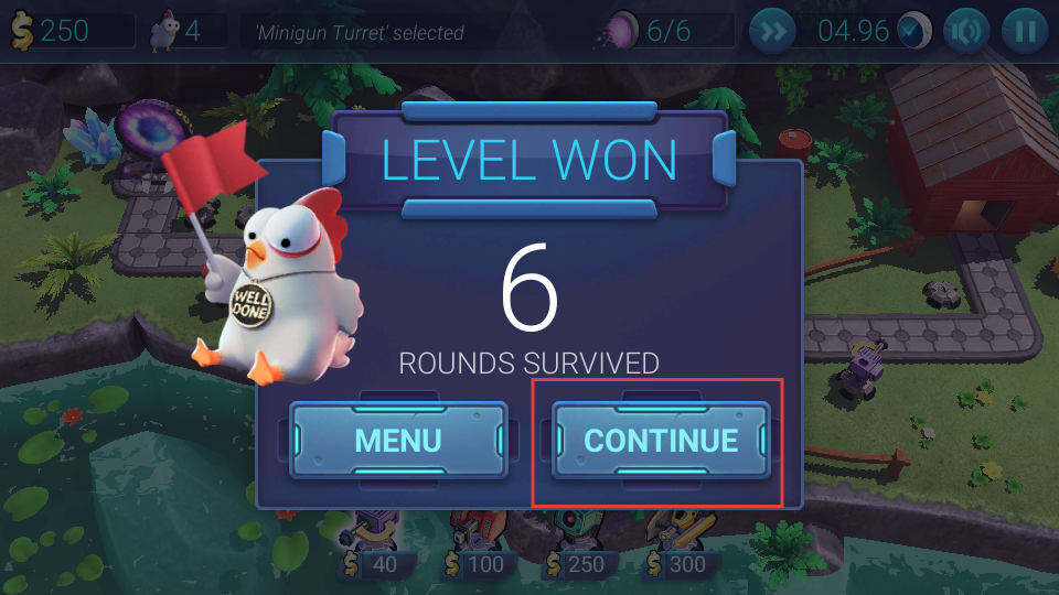 3、成功抵御所有波次的敵人后,關卡勝利,會顯示存活輪數等信息,點擊CONTINUE按鈕,就能進入下一個關卡繼續挑戰。