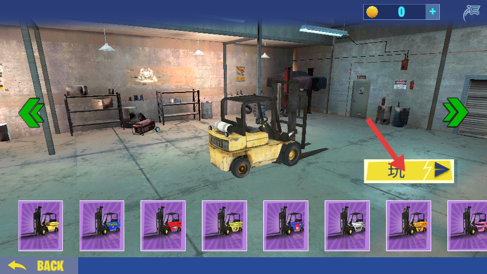 3、例如選定叉車模式后,界面展示出叉車及不同樣式的叉車選項,點擊玩按鈕即可進入叉車的實際操作關卡。