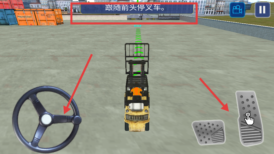 4、進入叉車操作場景,按照跟隨前頭停叉車的提示,通過左側方向盤控制方向,右側踏板控制車速,操控叉車沿指定路線行駛并???。