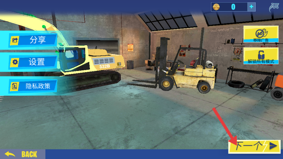 1、進入游戲初始界面,能看到挖掘機等設備,點擊右下角下一個按鈕,可推進游戲流程,進入后續選擇環節。