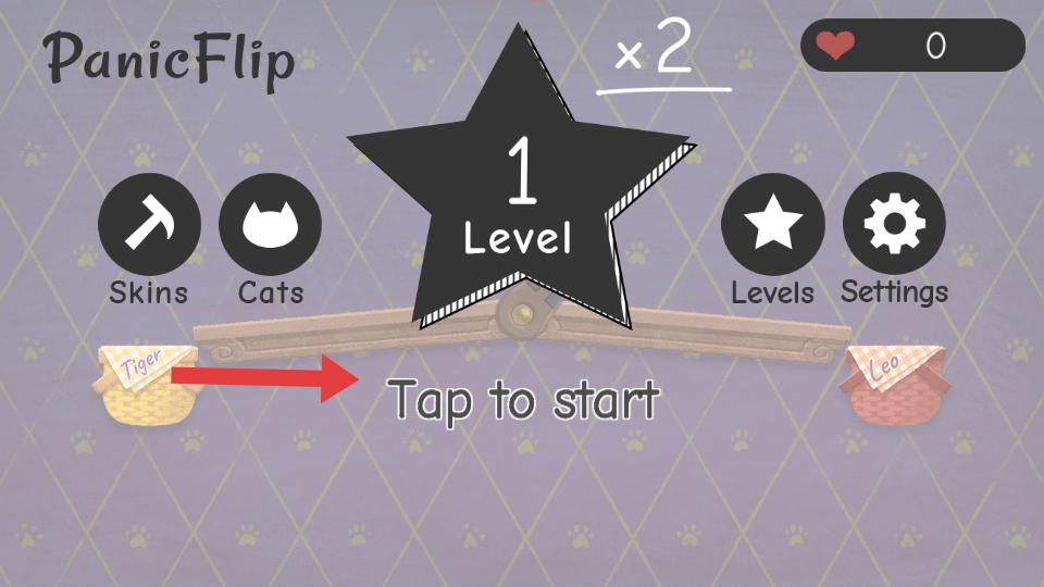 1、進入游戲,看到PanicFlip標題界面,有Skins,Cats等功能按鈕,點擊Tap to start,開始游戲。