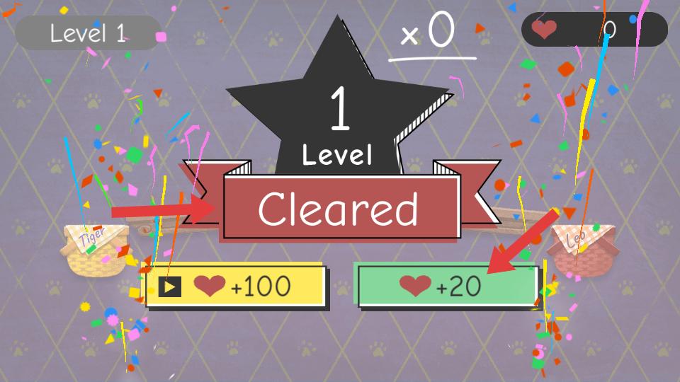 3、成功完成關卡后,會顯示Cleared界面,還能獲得愛心獎勵,可選擇繼續獲取更多愛心或進入下一關。