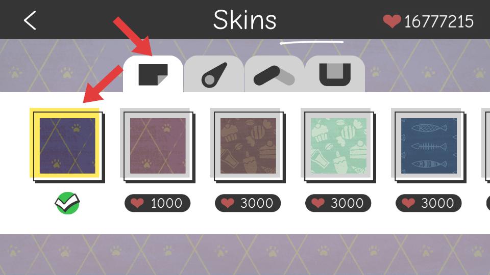 4、進入Skins界面,能看到多種皮膚,可花費愛心解鎖喜歡的皮膚,更換游戲界面外觀。