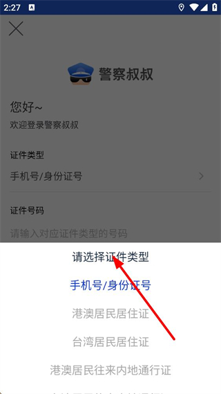 3、點擊證件類型選項后,彈出選擇彈窗,可選擇手機號、身份證號、港澳居民居住證等不同證件類型。