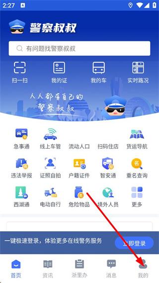 1、進入警察叔叔首頁,含搜索欄及掃一掃等功能,還有急事通等服務入口,底部設多個選項,點擊我的進入登錄頁面。