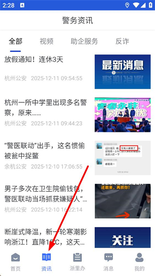 4、進入資訊頁面,含全部視頻等分類,展示多條警務資訊內容,可查看各類警務相關的通知與動態。