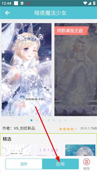 3、主題下載完成后,詳情頁會顯示應用按鈕,點擊該按鈕,即可將暗夜魔法少女主題設置為當前設備的鎖屏樣式。