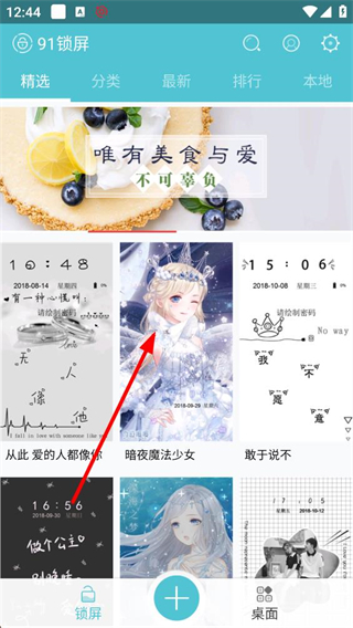 1、進入91鎖屏精選界面,可瀏覽多款鎖屏主題,找到暗夜魔法少女主題選項,查看其展示樣式,準備開展后續的主題操作。