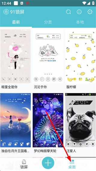 4、應用主題后返回91鎖屏主界面,可切換至桌面板塊,瀏覽更多不同風格的主題,或管理已使用的鎖屏相關內容。