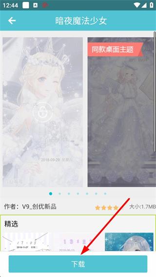 2、點擊暗夜魔法少女主題進入詳情頁,能查看主題預覽圖、作者信息,點擊頁面中的下載按鈕,獲取該鎖屏主題資源。
