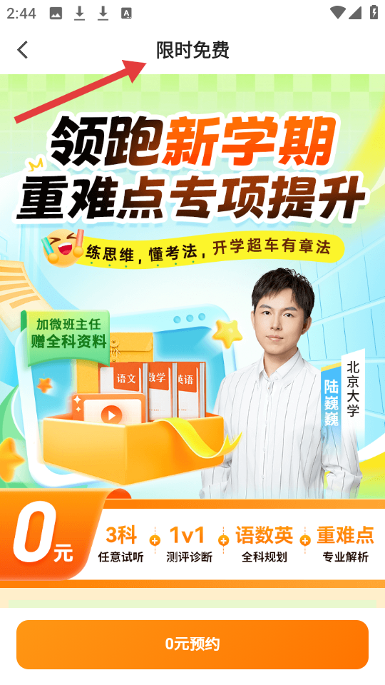 1、點限時免費活動頁喊出領跑新學期,北大的陸巍巍助力,提供語數英試聽、測評診斷等,0元即可預約提升學科重難點。