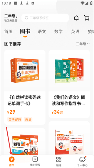 1、首頁的圖書板塊,針對三年級,推薦自然拼讀密碼速記單詞手卡等圖書,還有語文、數學等學科分類入口。