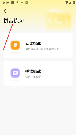 3、拼音練習頁面,有認讀挑戰適合零基礎或基礎薄弱學生、和拼讀挑戰適合一年級學生兩個練習選項。