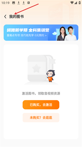 4、我的圖書頁面可激活已購圖書領取音視頻資源,也能點擊未購買去逛逛去選購圖書,還有全科集訓營預約入口。