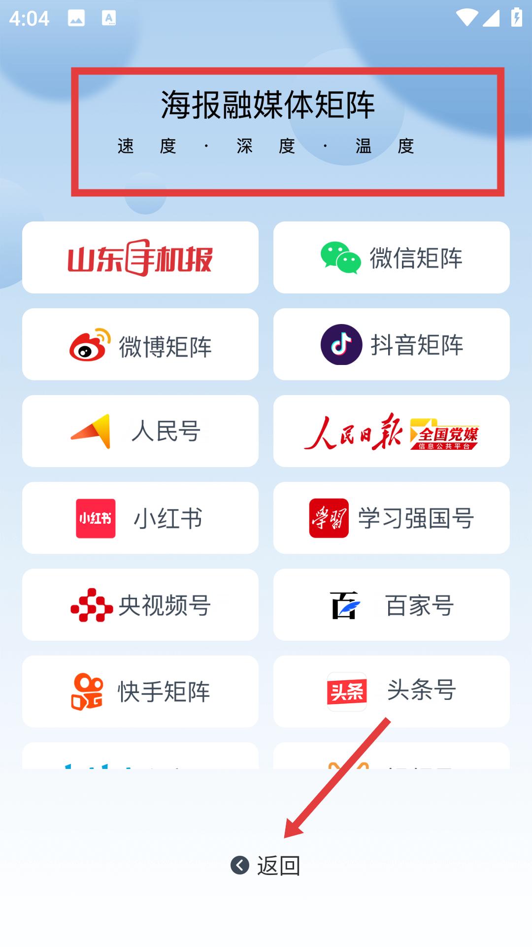 2、進入海報融媒體矩陣頁面,看到山東手機報,微信矩陣等多個平臺入口,若想返回上一級頁面,點擊頁面底部返回按鈕。
