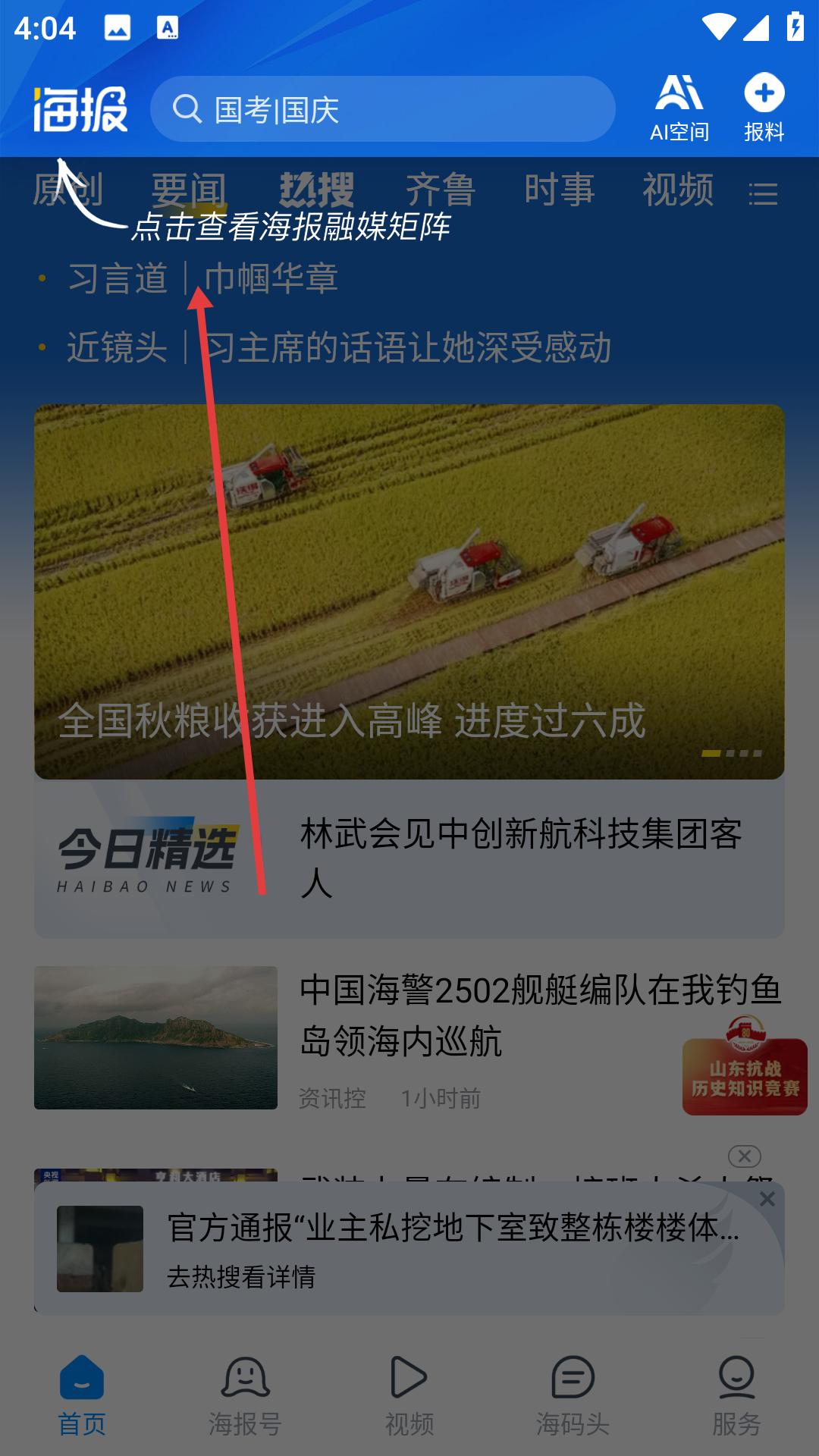 1、打開海報新聞APP,進入首頁頁面,根據下方的提示,點擊海報按鈕查看海報融媒體矩陣。