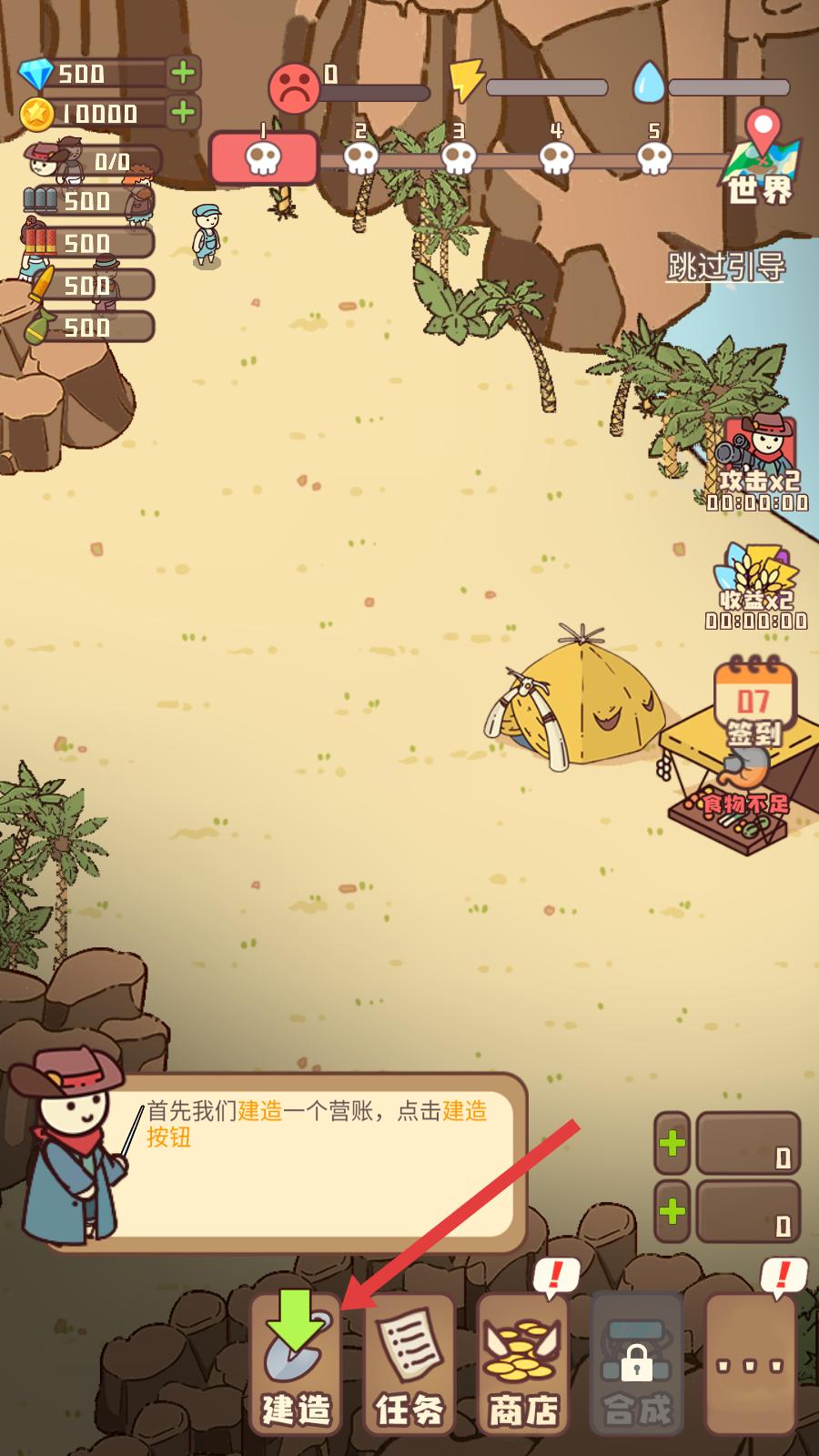 2、進入村莊建設場景后,看到界面下方有建造、任務、商店等按鈕,按照提示點擊建造按鈕,進入建造選項界面。