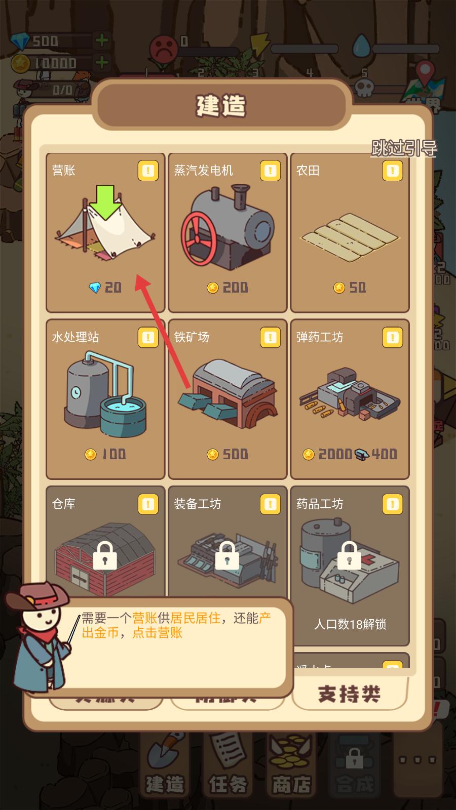 3、進入建造選項界面后,看到有營帳、蒸汽發電機、農田等多種建造選項,按照提示點擊營帳選項,進行營帳建造,推進村莊建設進程。