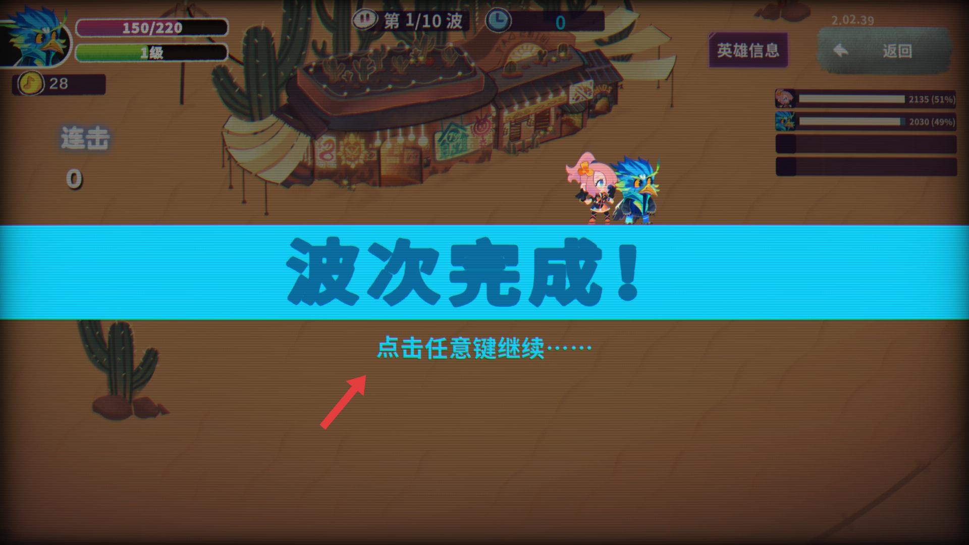 4、當屏幕顯示波次完成時,點擊任意鍵,即可繼續進行下一波戰斗,不斷挑戰獲取更多獎勵與經驗。