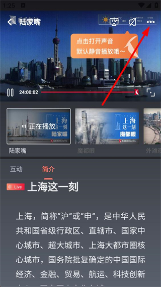 3、進入直播播放頁可查看上海相關實時畫面,默認靜音播放,可點擊開啟聲音,還能切換不同直播視角,了解多場景內容。