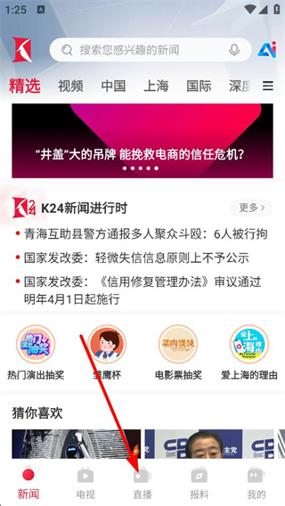 1、進入新聞頁面可瀏覽精選資訊,包含社會事件政策動態等內容,通過頂部搜索欄查找信息,底部導航可切換至直播等功能板塊。