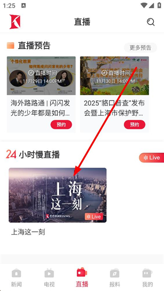 2、直播頁面可查看直播預告,包含 不同主題的直播活動,點擊預約可提醒觀看,還能進入24小時慢直播,實時觀看相關內容。