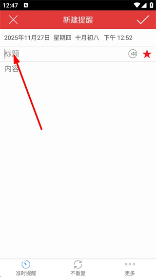 3、進入新建提醒界面,需填寫提醒標題、內容,系統默認填充當前日期時間,還可設置提醒鈴聲、標記星標等,完善信息后可保存。