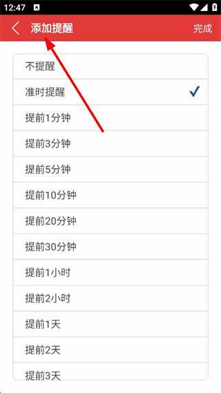 4、點擊準時提醒選項,可進入添加提醒界面,選擇不提醒、準時提醒或提前不同時長提醒,選定后點擊完成,即可設置提醒的觸發時機。