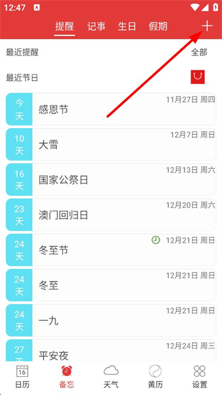 2、備忘頁面能看到最近提醒、最近節日列表,點擊右上角加號按鈕,即可進入新建提醒界面,準備添加新的提醒事項。