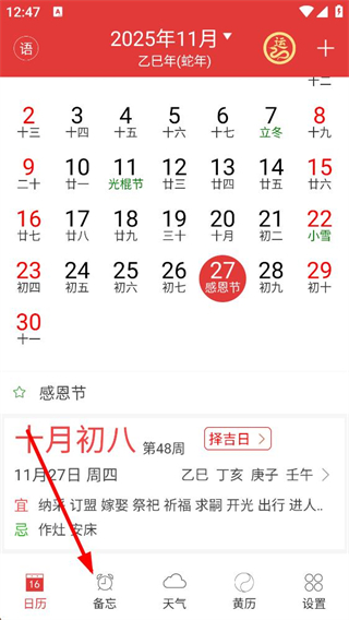 1、進入應用日歷頁面,可查看當月日期、節日及當日黃歷信息,底部有日歷、備忘等功能按鈕,點擊備忘可進入提醒管理頁面。